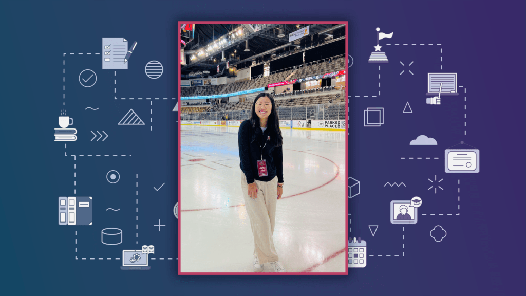 As a Sports Media major, Jia Skrudland ’26 enjoys having behind-the-scenes looks of game days interning with the professional ice hockey team, Indy Fuel. As the Game Operations Intern, she helps ensure game and fan engagement activities run smoothly.