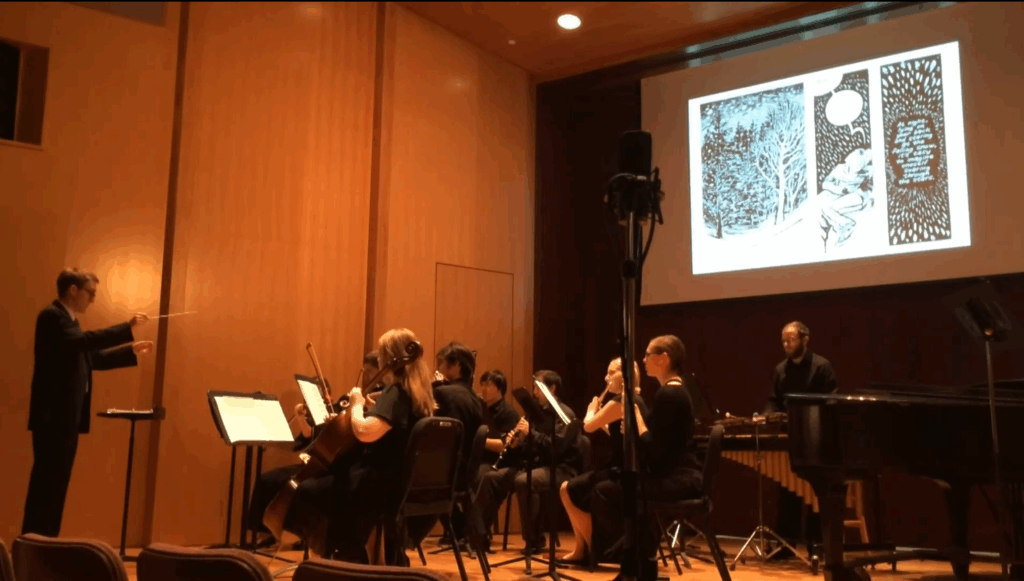 That creative trust led to one of Harris’s most formative experiences: his Butler Summer Institute project. The idea was ambitious—adapt a graphic novel into a live multimedia performance featuring projected panels, a full orchestral score, and voice actors. With encouragement and guidance from faculty, Harris composed the score, organized the performers, and produced the entire show.